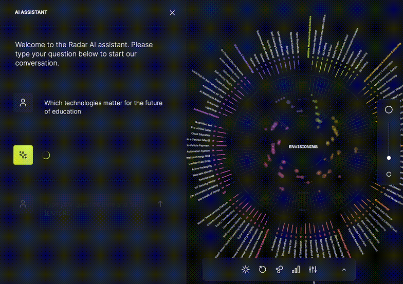 Envisioning has been focused on integrating conversational intelligence into our research radars, and we are exploring approaches for interfacing with data visualization using AI. To showcase this, we are preparing an update to our Cities Radar with a few new functionalities, including a chat interface which allows you to navigate and rank the underlying research data with an assistant.
