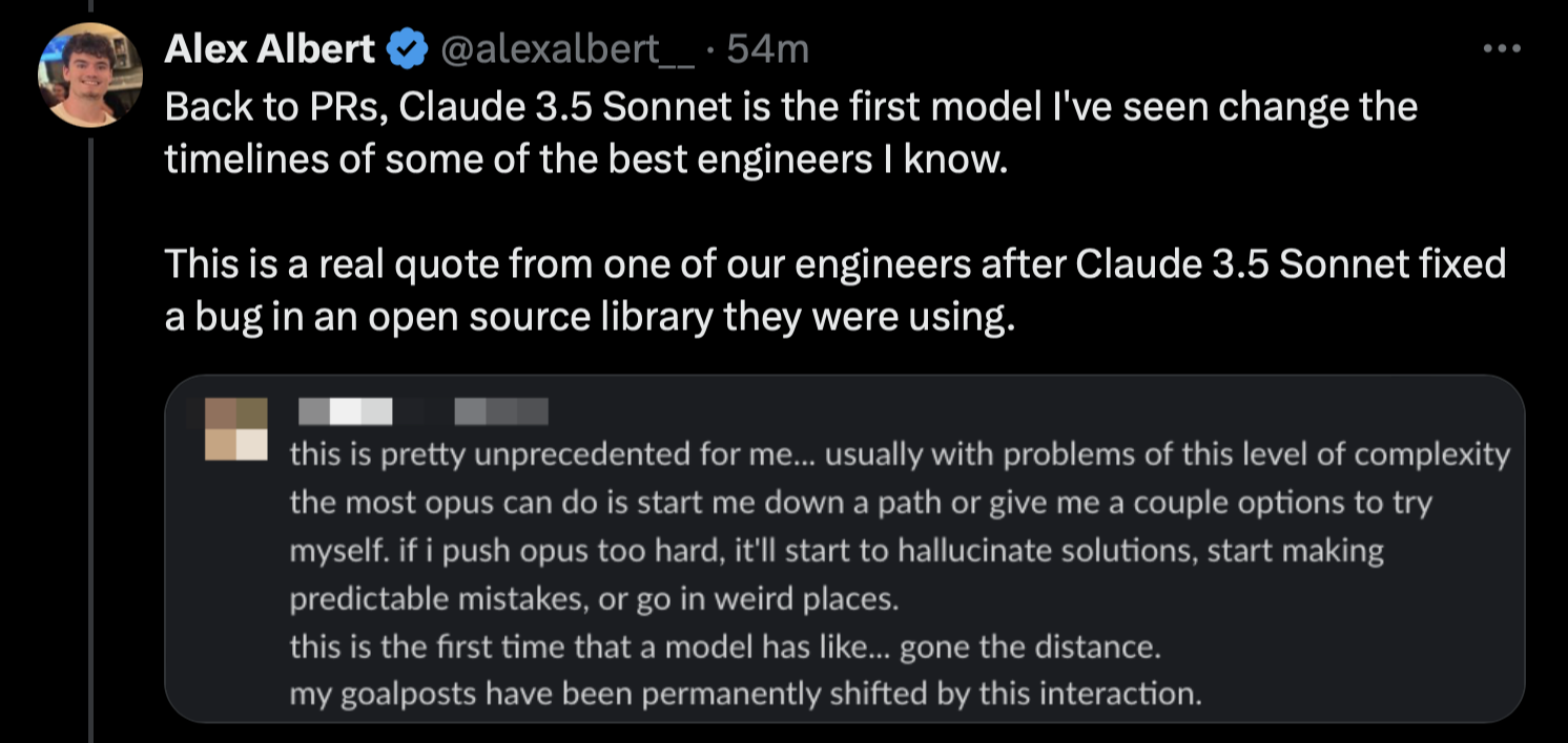 Everyone aboard the hype train. Having done a fair bit of coding with ChatGPT, but never quite getting used to Github CoPilot, Claude 3.5 is genuinely exciting.