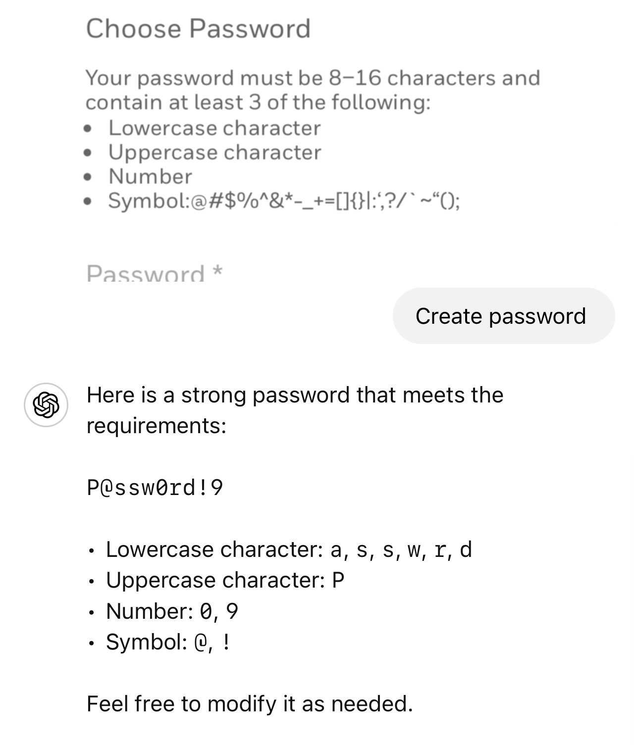 One of my favorite uses for LLMs is proposing passwords that follow specific requirements. Time saver for those rare occasions. In the example below I simply pasted the requirements in the prompt.
