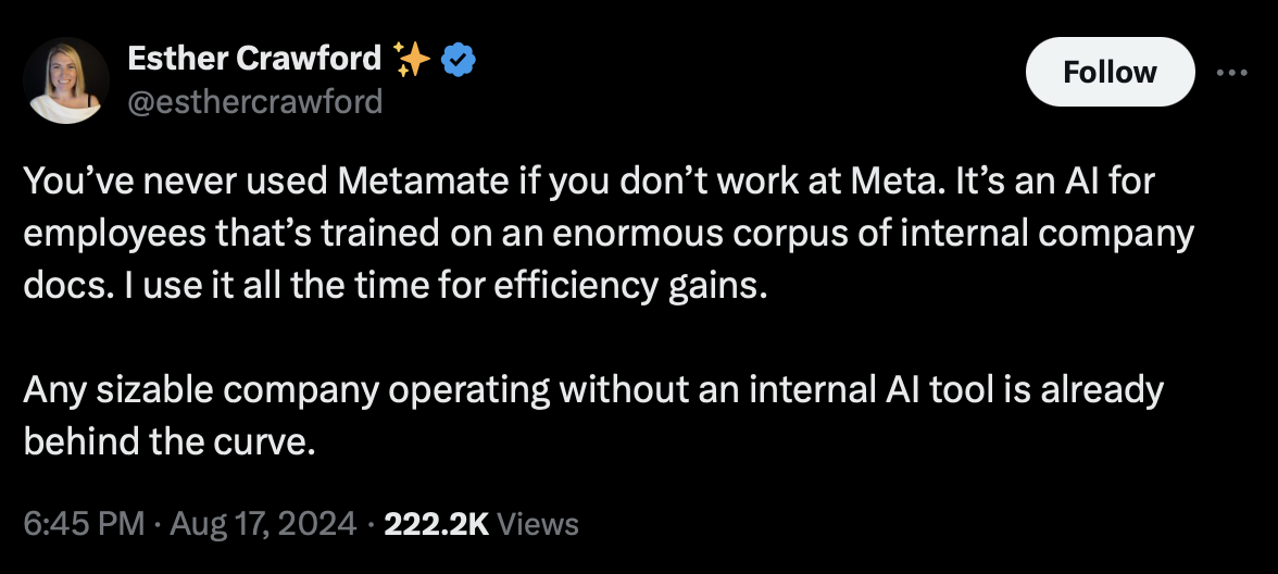 I think most companies will end up implementing something like Meta's Metamate, a company-wide AI assistant helping their workers. There's almost no info about this on the web, but here's a great thread disclosing a couple of use cases.