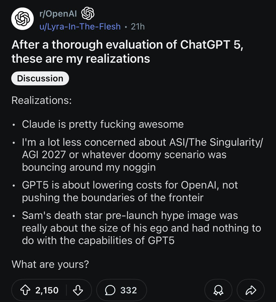 Some users seemed upset that the previous, more verbose models went missing, which was reported on as faux pas by OpenAI, but to me simply signals how little the developers and their training cohorts care about perceived niceness. GPT-5 has apparently been tweaked to compensate for its curtness over the weekend, but I haven’t noticed.