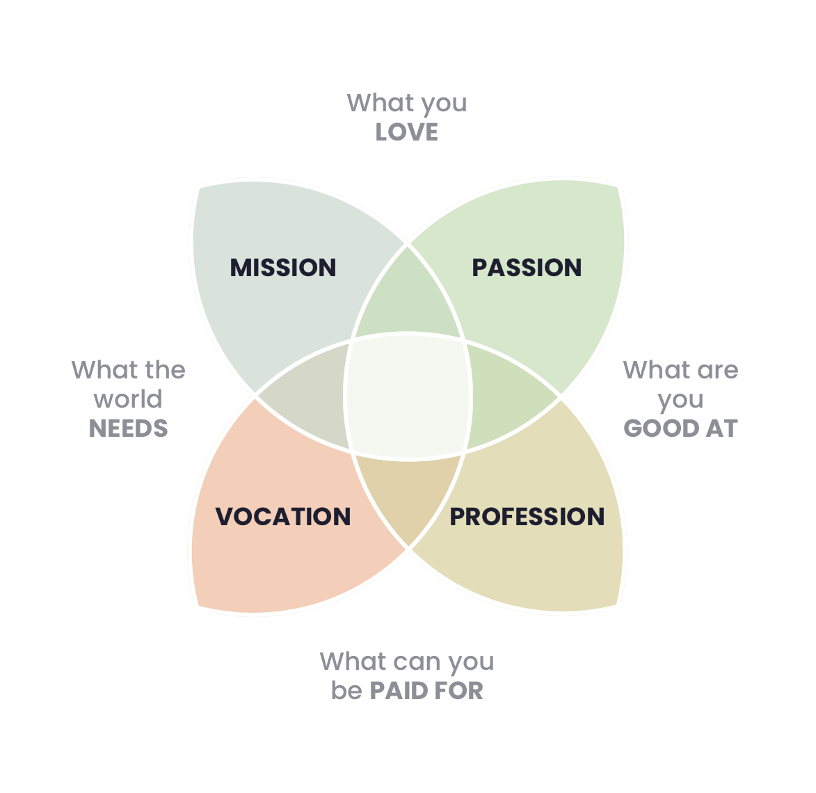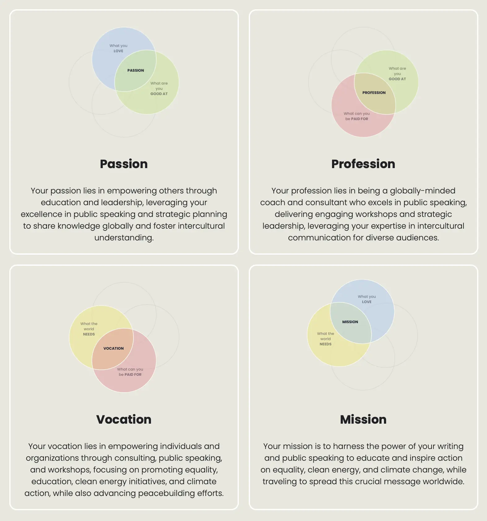 Our system then identifies the intersections between each list, and thus helps them identify their supposed mission, passion, vocation and profession.