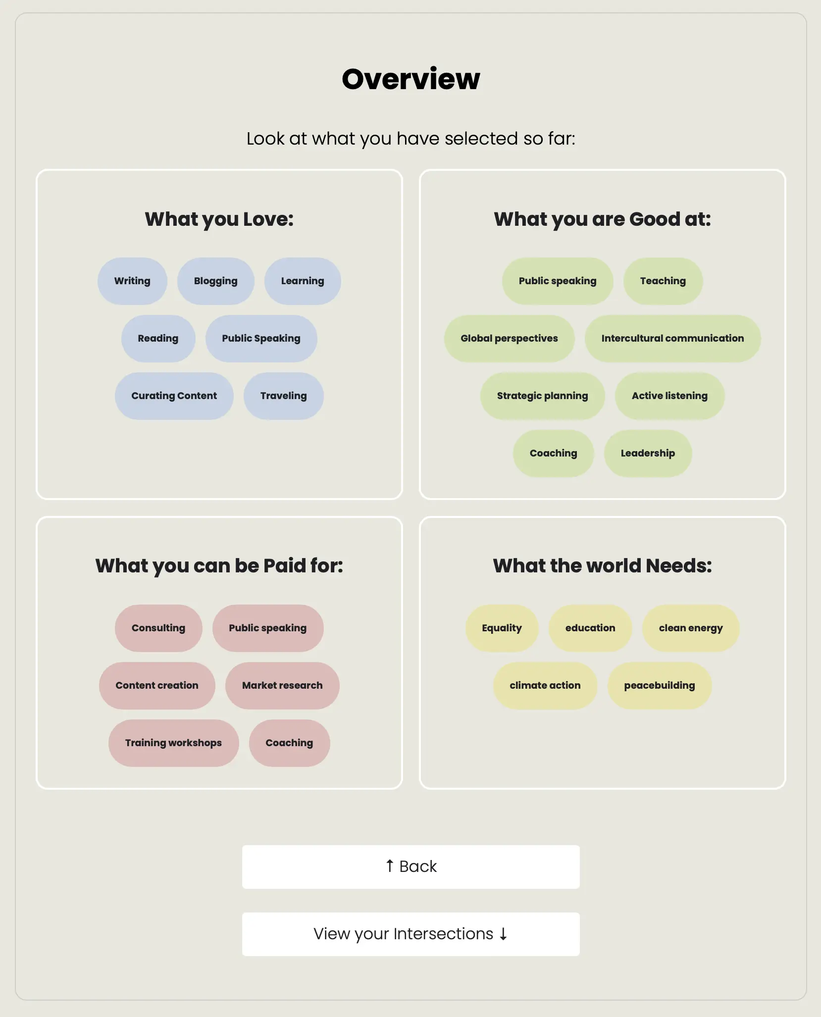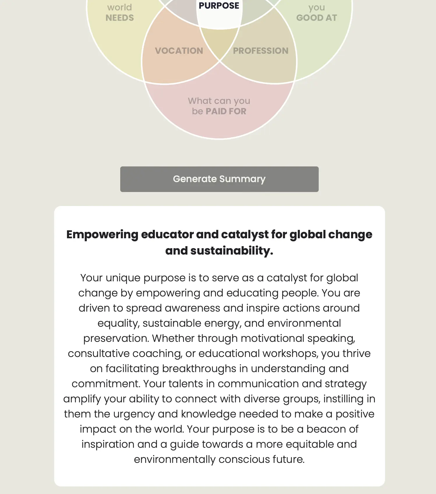After completing these intersection, we receive a personalized summary of our Purpose, based on our inputs and selections. This takes into consideration what all elements have in common, thus facilitating our personal sense of development.