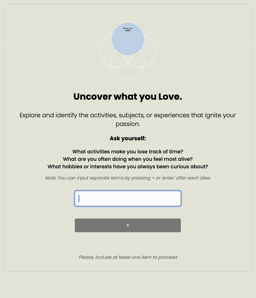 The tool has been designed to facilitate a user's journey in performing a personal "Ikigai" analysis. Users begin by inputting a couple of things they love – which GPT expands upon by giving users other terms they might also love, indicated by selecting them. Users then do this again for things they are good at, the world needs and can be paid for.