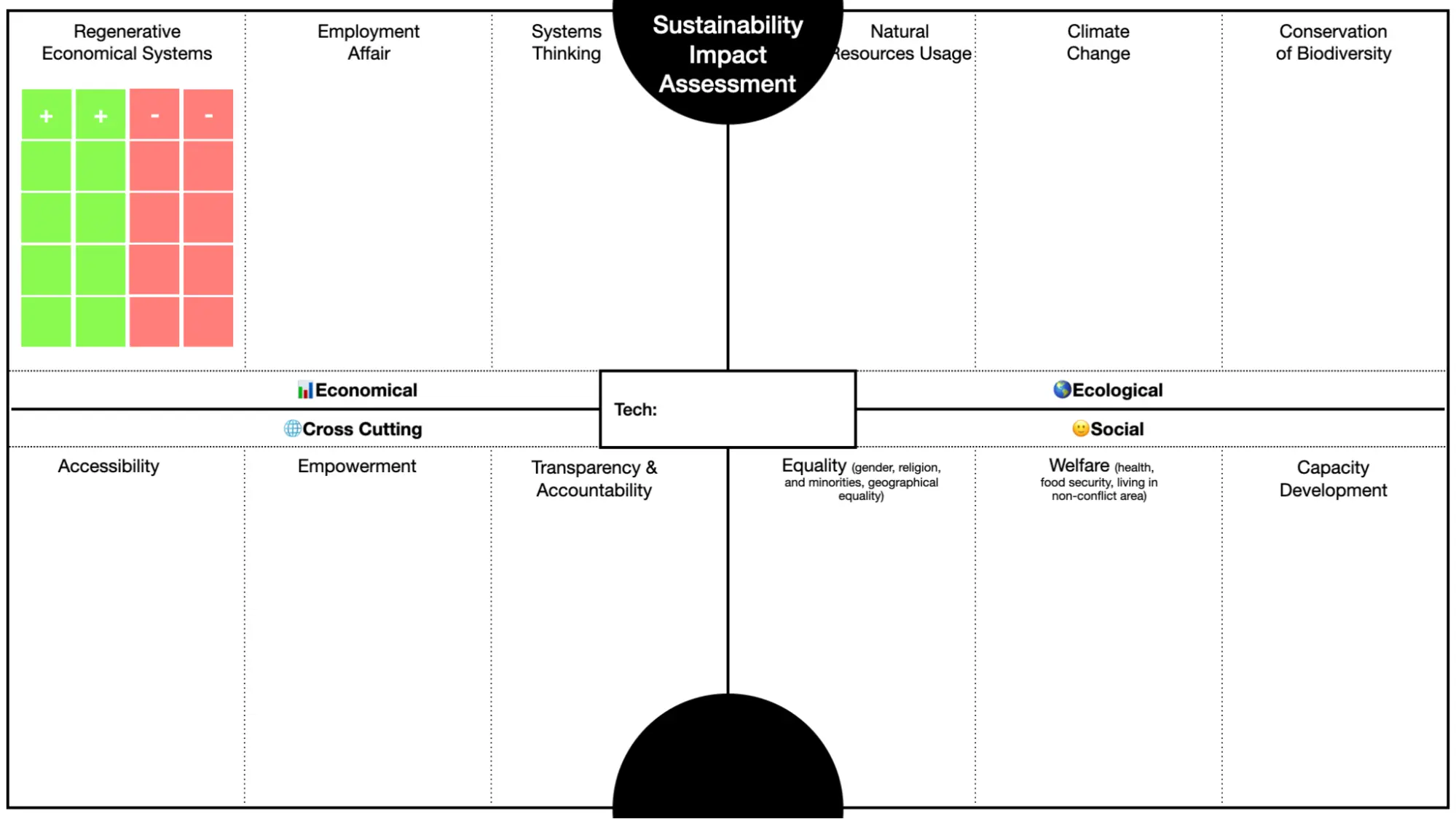 For this pilot, we were tasked with creating an AI-powered workshop for experts to assess the sustainable impact of emerging technologies for the techDetector. GIZ and Envisioning had already crafted internal assessment questions for different impact dimensions: Economic, Ecological, Social and Cross-Cutting (aspects dealing with accessibility, accountability and transparency). Our assignment was to translate this framework into a new format using our workshop-friendly interface powered by ChatGPT.