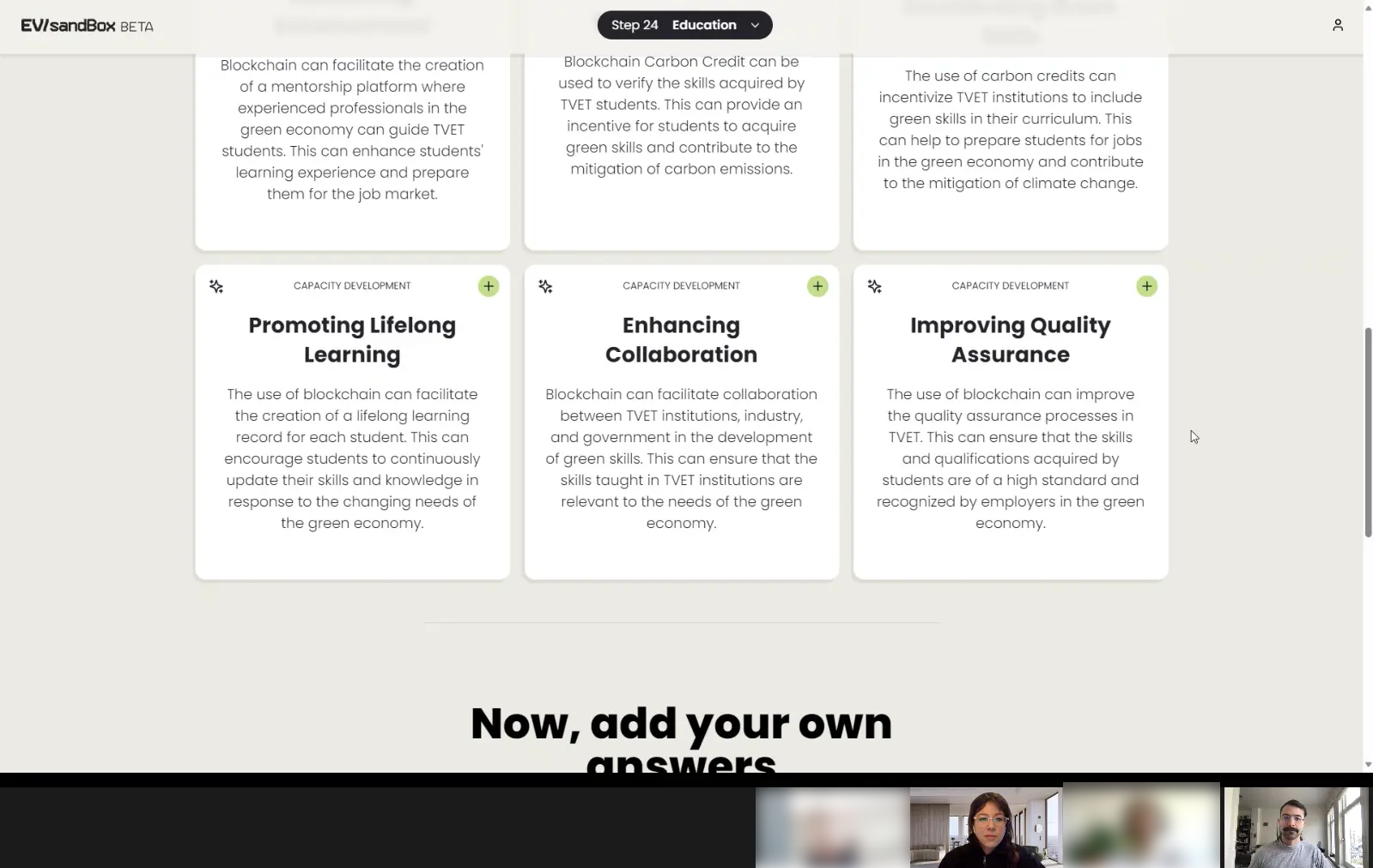 The same participants were at times impressed by connections they hadn’t thought of and, sometimes in the same round, giggling at farfetched answers. Blindspots and hallucinations had to pass by the sieve of experts in the loop. This shows how AI could not do the work by itself, as it still needs human and professional input. It also optimized human effort and enhanced expert knowledge by broadening possibilities and guiding conversations.