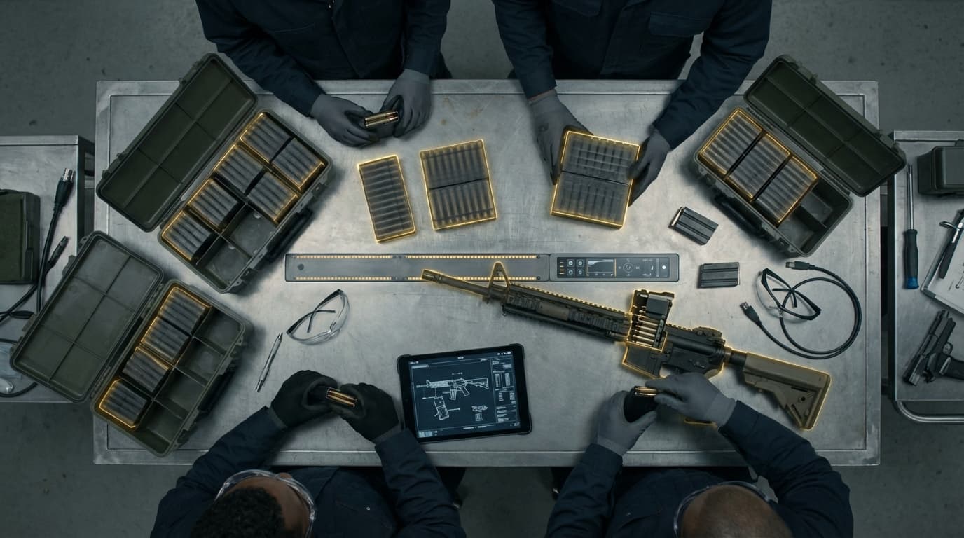Caseless ammunition eliminates the brass cartridge case; propellant is bonded or formed around the projectile. Benefits: lighter and cheaper ammunition; simpler firearms design. Field tests and limited commercialization; Lightweight Small Arms Technologies research. Challenges include heat dissipation, moisture sensitivity, and reliability.