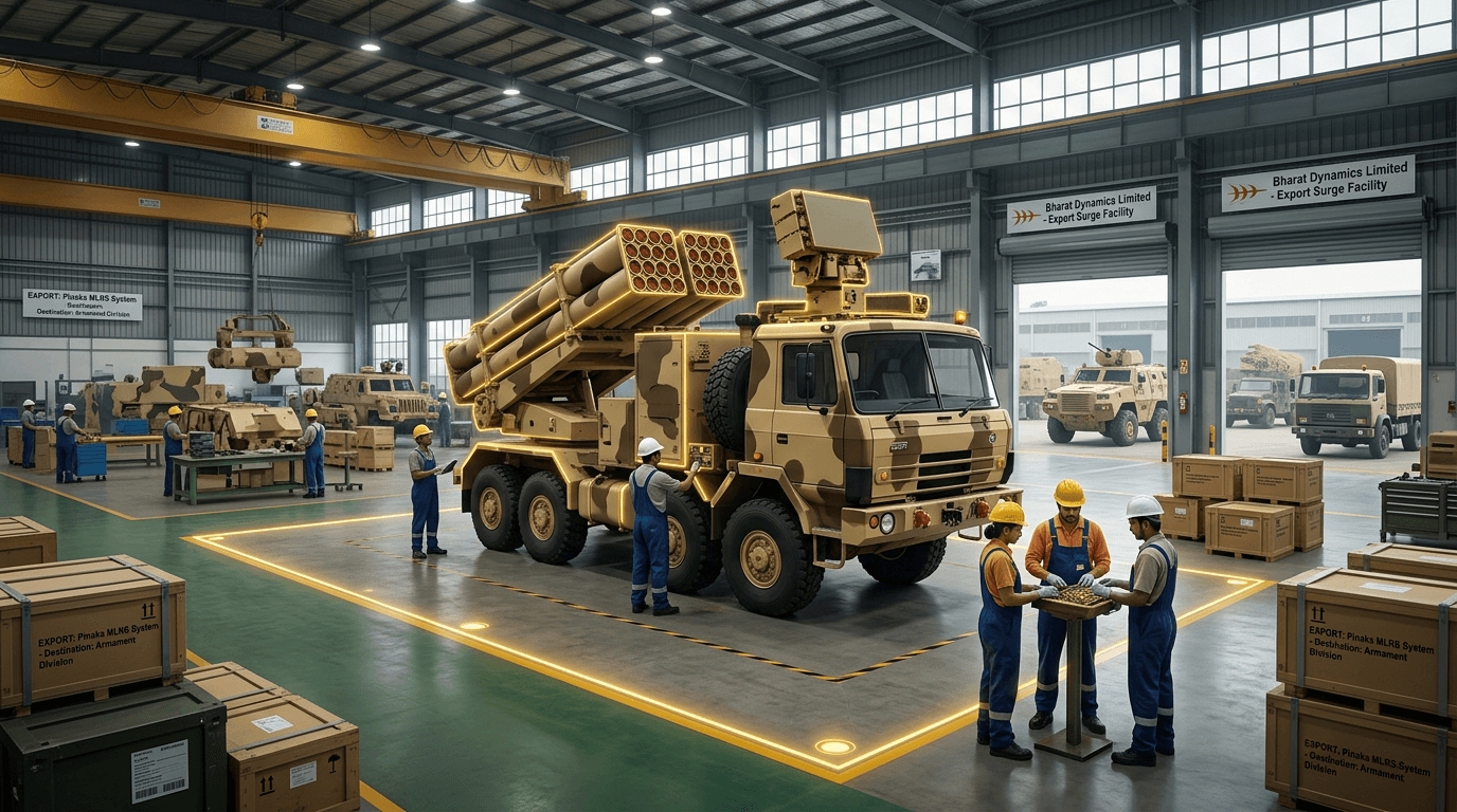 The shift is driven by multiple policy initiatives: defense procurement rules mandating indigenous content, two dedicated defense industrial corridors (in Uttar Pradesh and Tamil Nadu), increased FDI limits in defense manufacturing, and a positive list of items banned from import to force domestic production. Key export products include BrahMos missiles, Pinaka rocket systems, Akash air defense missiles, AK-203 rifles (manufactured under license), and various naval platforms.
