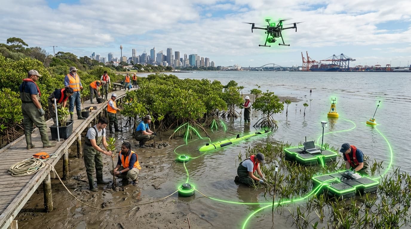 Blue carbon projects replant mangroves, seagrasses, and salt marshes that can store up to 10× more carbon per hectare than terrestrial forests while defending coasts from storms. Restoration teams use drones, biodegradable seed pods, and hydrodynamic modeling to reestablish tidal flows and sediment regimes. Acoustic sensors, eddy-covariance towers, and satellite SAR track biomass and soil carbon, feeding MRV platforms that underpin carbon-credit issuance.