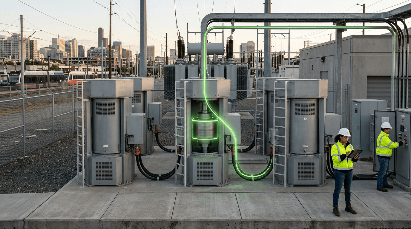 Flywheel energy storage converts electrical energy into kinetic energy by accelerating a rotor, and recovers it via regenerative braking. Modern systems use magnetic bearings, vacuum chambers, and composite rotors to minimize friction and achieve high rotational speeds. Applications include power quality (frequency regulation, voltage support), uninterruptible power supply (UPS), and short-duration grid balancing. Limited commercialization exists; Beacon Power and others have deployed grid-scale flywheels.