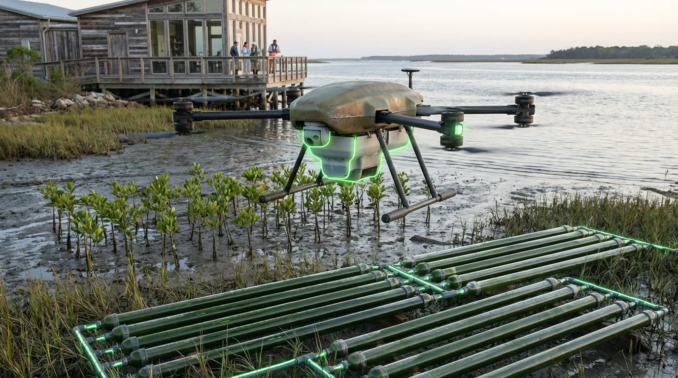 Precision carbon-removal platforms pair remote sensing, AI planning, and robotics to accelerate reforestation and ecosystem repair. Drone swarms map soil moisture, biodiversity, and erosion, then fire seed pods or seedballs optimized for local conditions, planting tens of thousands of trees per day on steep or inaccessible terrain. Bioengineered algae strains, enhanced kelp, and microbial inoculants improve carbon uptake rates and soil health, while LoRa sensors monitor growth, soil carbon, and survival to feed MRV systems.