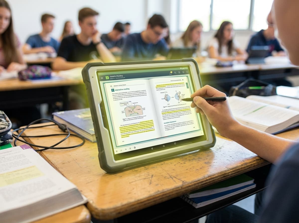 Tablet-based textbooks are rugged, education-focused tablet devices preloaded with digital curriculum content, interactive textbooks, and adaptive reading software that replace traditional printed textbooks while adding capabilities like multimedia content, interactive exercises, built-in dictionaries, note-taking, and progress tracking. These devices use either e-ink displays (for reduced eye strain and long battery life) or LCD screens (for color and video content), and are designed to withstand the rigors of classroom use with durable construction, protective cases, and long battery life. Advanced systems include offline content storage for areas with unreliable internet, adaptive reading software that adjusts text complexity and presentation based on individual reading levels, and analytics that track student engagement and comprehension.