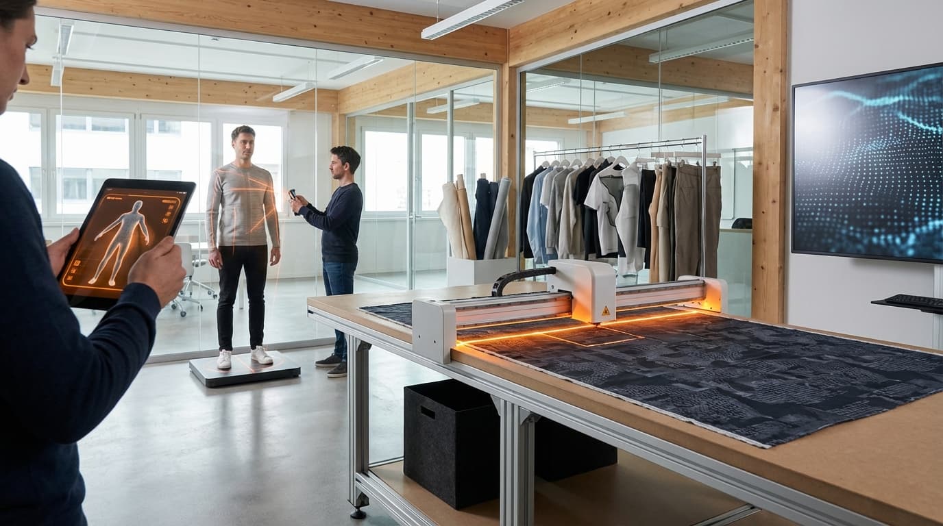 On-demand bespoke tailoring combines mobile body scanning technology, automated pattern generation, and flexible manufacturing to produce made-to-measure garments without the traditional time and cost barriers of custom tailoring. Customers use smartphone apps to capture body measurements through computer vision, and automated systems generate patterns, cut fabric, and assemble garments tailored to their exact dimensions.