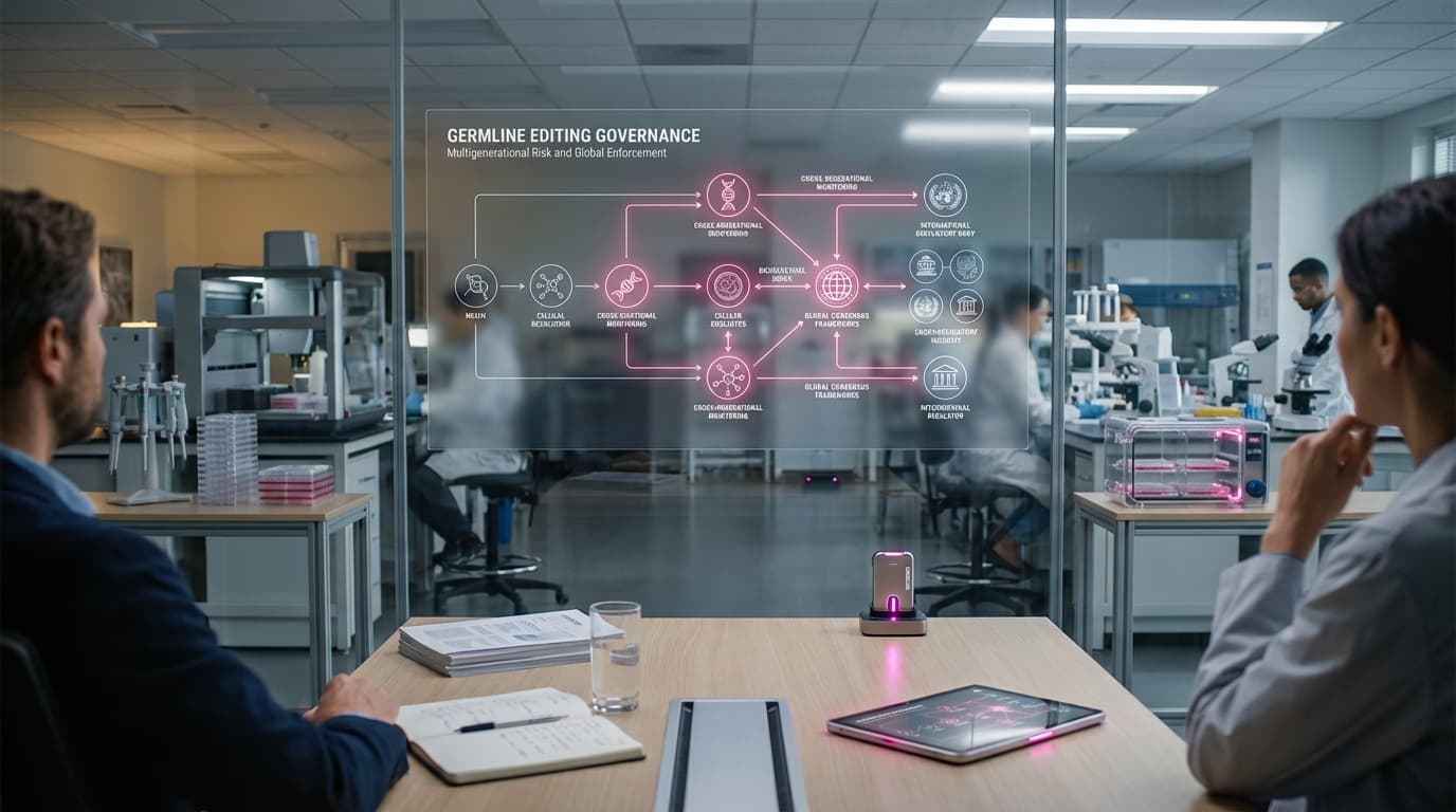 Germline editing governance encompasses the complex debates and policy frameworks surrounding heritable gene editing (modifying genes in eggs, sperm, or embryos in ways that would be passed to future generations), including discussions about multigenerational risks (unintended consequences that could affect future generations), polygenic selection (editing multiple genes to select for complex traits), accessibility gaps (ensuring equitable access to technologies), and enforcement of global moratoria (international bans or restrictions). Effective governance frameworks are essential to manage the profound ethical implications of heritable gene editing, which could permanently alter the human gene pool and raise questions about consent, equity, and the nature of human enhancement. International organizations, governments, and bioethics bodies are developing these frameworks.