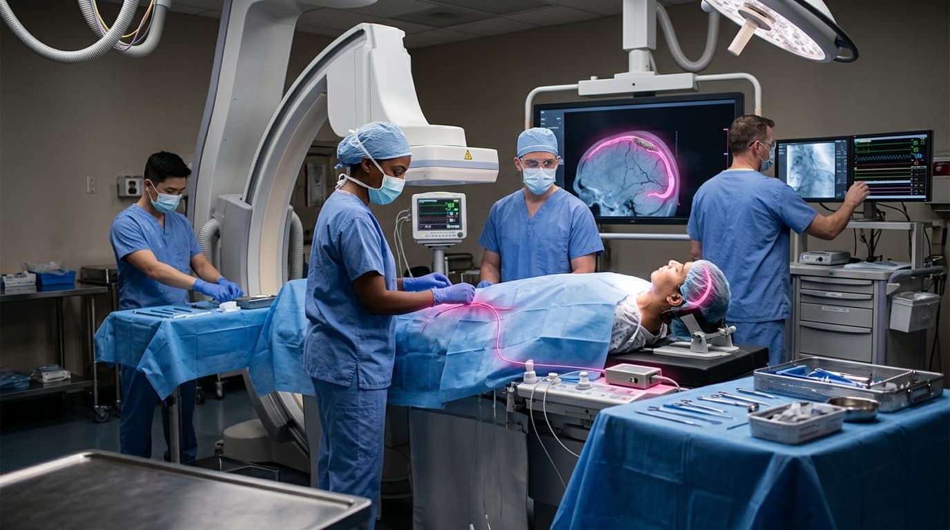 Minimally invasive BCIs seek to read neural signals without requiring open-brain surgery. Synchron's Stentrode is delivered through the jugular vein and positioned in blood vessels near the motor cortex — similar to a cardiac stent procedure. Precision Neuroscience developed an ultra-thin electrode array that slides between the skull and brain surface through a small incision, avoiding penetration of brain tissue.