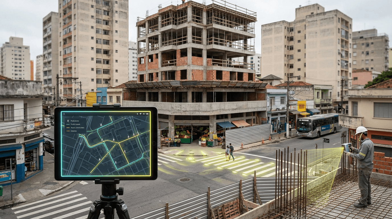 Compressão do raio de vida cotidiana descreve a redução da distância funcional entre moradia, serviços e trabalho, criando pressão por tipologias habitacionais e uso do térreo que permitam acesso a pé ou por transporte de curta distância. Mudanças nos padrões de trabalho (trabalho remoto, híbrido), preferências por proximidade (walkability, 15-minute city), custos de transporte e busca por qualidade de vida estão pressionando por desenvolvimento urbano que comprime distâncias funcionais, criando bairros onde moradia, trabalho, comércio e serviços estão próximos. Essa compressão pressiona tipologias habitacionais (unidades menores mas bem localizadas, co-living, unidades flexíveis) e uso do térreo (mais comércio e serviços locais, menos estacionamento, mais espaço público) para criar proximidade e acessibilidade.