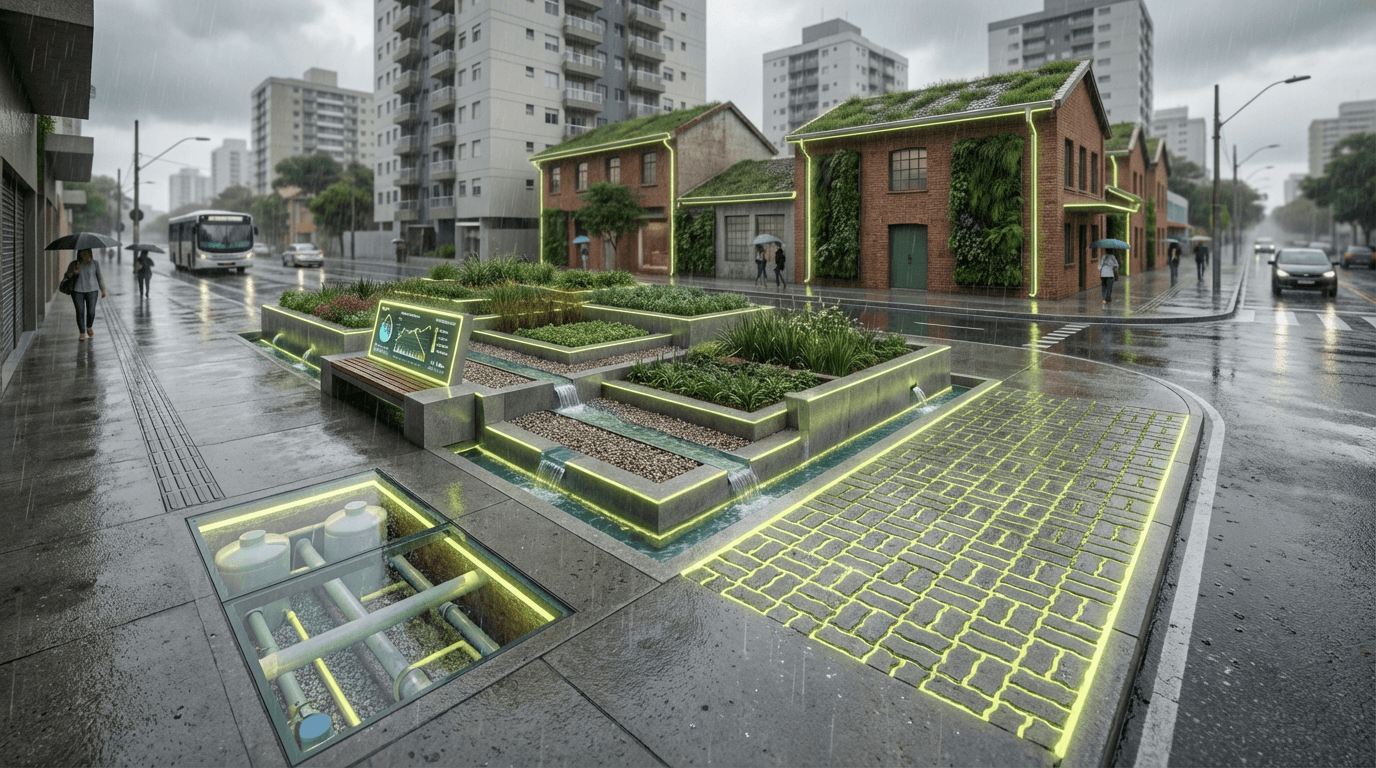 A infraestrutura verde-azul representa uma mudança fundamental na forma como as cidades brasileiras gerenciam o escoamento de águas pluviais, substituindo ou complementando os sistemas tradicionais de drenagem com soluções baseadas na natureza. Ao contrário da infraestrutura convencional "cinza" — que canaliza rapidamente a água da chuva através de tubulações subterrâneas e canais de concreto — essa abordagem integrada utiliza elementos paisagísticos funcionais para retardar, filtrar e infiltrar a água no solo. Os componentes principais incluem pavimentos permeáveis que permitem a passagem da água através de sua estrutura porosa, jardins de chuva projetados com camadas de solo e vegetação específicas para capturar e filtrar o escoamento superficial, bacias de biorretenção que temporariamente armazenam água enquanto removem poluentes, telhados verdes que absorvem precipitação e reduzem o volume de escoamento, e parques lineares ou alagáveis que funcionam como áreas de transbordamento controlado durante eventos de chuva intensa. Essas tecnologias operam através de processos naturais de infiltração, evapotranspiração e retenção temporária, transformando superfícies urbanas em sistemas multifuncionais de gestão hídrica.