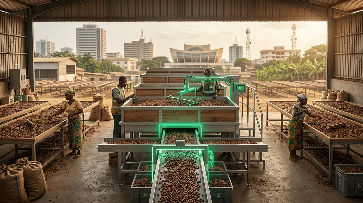 The technology is deceptively simple but systemically sophisticated. Unlike Ivory Coast (the world's largest producer), where quality is variable, Ghana's COCOBOD employs over 5,000 quality controllers who physically sample and grade every lot using standardized cut tests (slicing beans to check fermentation depth and uniformity). The fermentation protocol — turning frequency, heap size, covering material, duration — has been optimized through decades of research at Ghana's Cocoa Research Institute (CRIG). Digital moisture meters, bean-count standards, and mycotoxin testing are integrated at export points.