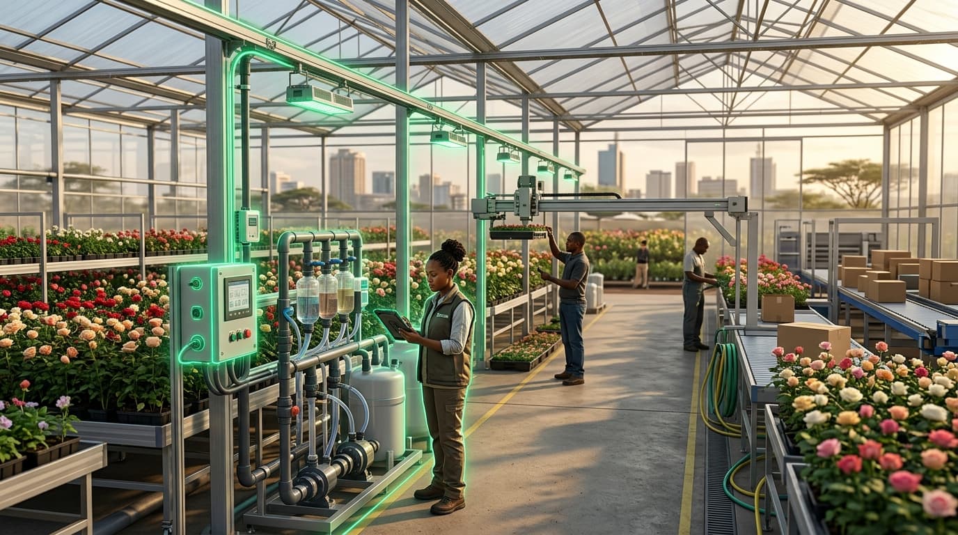 Kenya is the world's third-largest cut flower exporter (after the Netherlands and Colombia), shipping over 200,000 tonnes annually — primarily roses grown in greenhouses around Lake Naivasha at 1,900m altitude. The industry has developed a distinctive technology stack: greenhouse ventilation systems adapted for equatorial day-length patterns, fertigation (combined fertilization and irrigation) with closed-loop nutrient recycling, artificial lighting to manipulate photoperiod for year-round bloom timing, and integrated cold chains from farm gate to Nairobi airport to European auction houses.