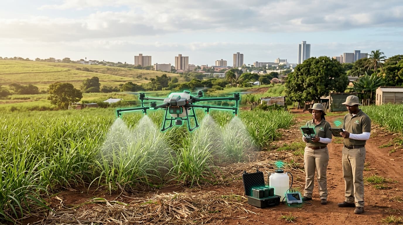 Precision drone spraying is being adapted for Africa's smallholder farming context, where the average farm is 2-5 hectares — too small for traditional precision agriculture equipment but large enough to benefit from aerial application. In KwaZulu-Natal, South Africa, a shared-service model allows cooperatives of smallholder sugarcane farmers to access drone spraying technology collectively, with documented yield increases of up to 1.78 tons per hectare from uniform ripener application.
