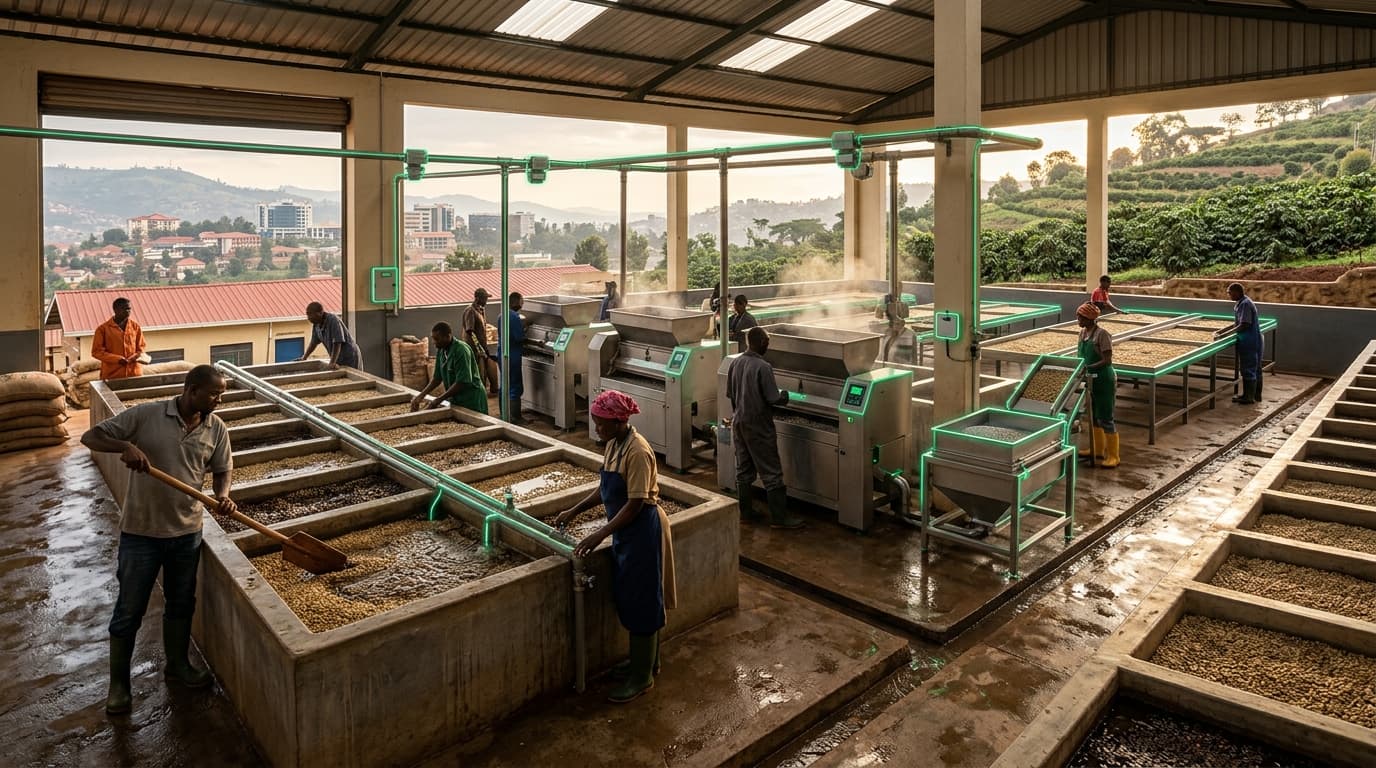 Rwanda's coffee sector was revolutionized by the rapid deployment of coffee washing stations (CWS) — wet processing facilities where cherries are pulped, fermented in tanks for 12-72 hours, washed in grading channels, and dried on raised African beds. The country went from a single washing station in 2002 to over 245 by 2015, with both cooperative-owned and private CWS now producing fully washed specialty coffee that commands $3-8/lb at international auctions versus $1-2/lb for semi-washed grades. The technology includes mechanical pulpers, fermentation tanks with controlled drainage, density-graded washing channels, and solar drying tables.