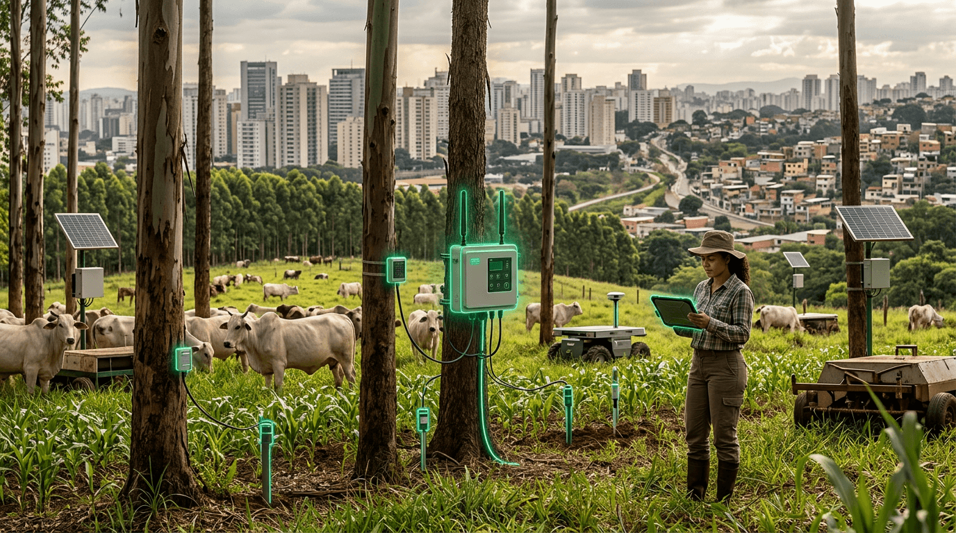 ILPF (Integração Lavoura-Pecuária-Floresta) rotates or intercropts grain crops, livestock grazing, and tree plantations on the same area. Trees provide shade for cattle (improving weight gain), crops provide revenue during tree establishment, and cattle fertilize the soil — a closed-loop system.
