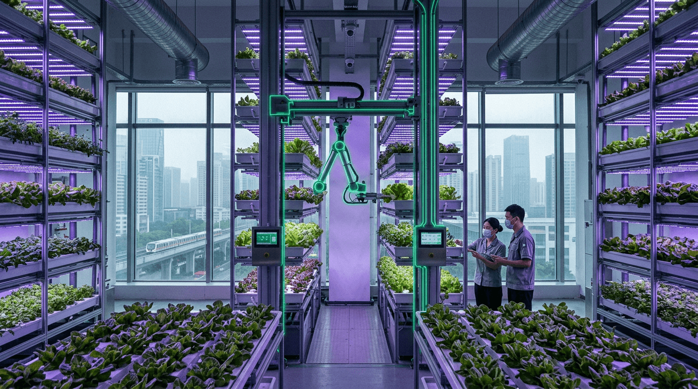 Vertical farms stack growing trays in climate-controlled buildings, using LED lights and hydroponics instead of soil and sunlight. Chinese facilities in Shanghai, Guangzhou, and Chengdu grow leafy greens, herbs, and strawberries year-round, independent of weather and season.