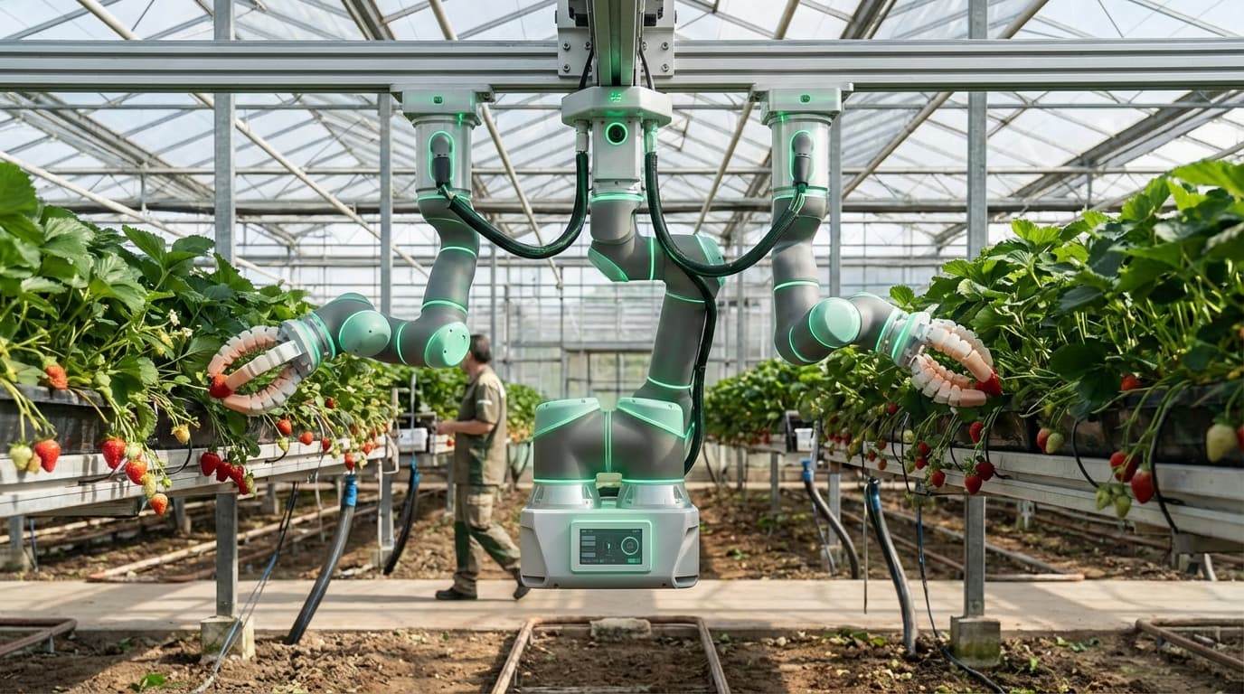 Robotic strawberry harvesters combine SLAM navigation, hyperspectral imaging, and deep learning classifiers to detect ripeness, predict occluded fruit, and maneuver end-effectors through dense greenhouse foliage. Soft, compliant grippers or suction cups pluck berries without bruising and place them into punnet trays while simultaneously logging size, color, and quality data for packhouse analytics.