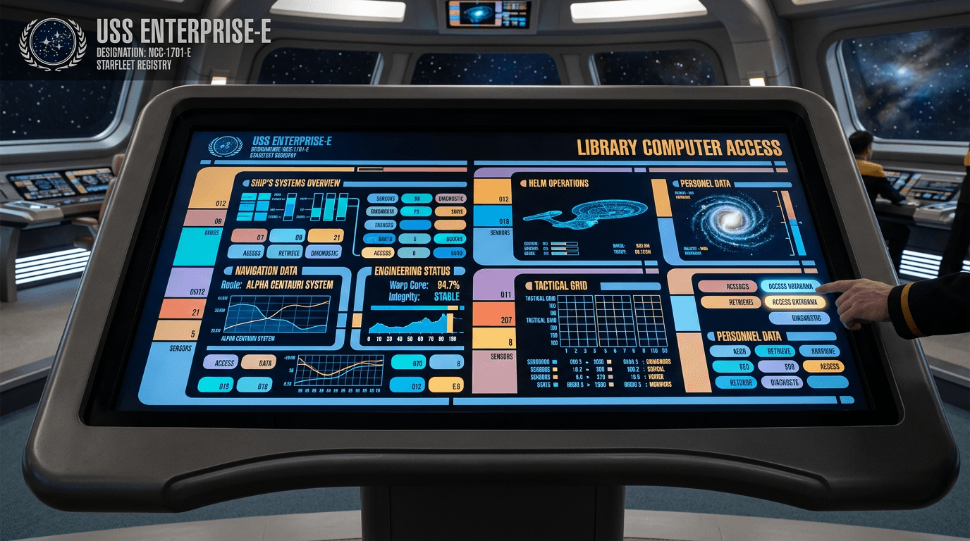 LCARS, or the Library Computer Access and Retrieval System, represents a conceptual approach to human-computer interaction that emerged from Star Trek's vision of 24th-century computing. The system is imagined as a unified interface architecture that consolidates access to all spacecraft systems—from environmental controls and navigation to tactical operations and scientific databases—through a distinctive visual language of color-coded panels, curved geometric elements, and hierarchical information displays. Unlike contemporary operating systems that separate applications and functions, LCARS is conceived as an integrated framework where every ship system speaks a common interface language, allowing crew members to transition seamlessly between controlling life support, analyzing sensor data, or accessing library archives. The fictional system incorporates multimodal interaction through touch panels, voice commands, and gesture recognition, with an underlying artificial intelligence that learns individual user preferences and adapts interface layouts accordingly. This design philosophy reflects a speculative endpoint where computing becomes ambient and intuitive rather than application-centric.