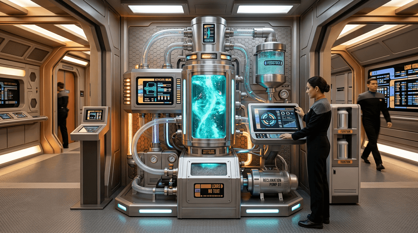 This concept appears prominently in strategic thinking about space exploration and closed ecological systems because it addresses a fundamental constraint: mass. Every kilogram launched into orbit or transported across interplanetary distances carries enormous cost, making traditional linear consumption models—where materials are used once and discarded—economically and logistically untenable for extended missions. The matter recycler serves as a narrative solution to this problem, enabling spacecraft or space stations to approach near-perfect material efficiency by continuously cycling the same atoms through different forms. This connects to real research in life support systems, where agencies like NASA and ESA have developed increasingly sophisticated water reclamation systems that recover over 90% of moisture from all sources aboard the International Space Station. Current materials research also explores chemical recycling methods that can break polymers back into monomers, though these processes remain far from the atomic-level reclamation depicted in fiction.