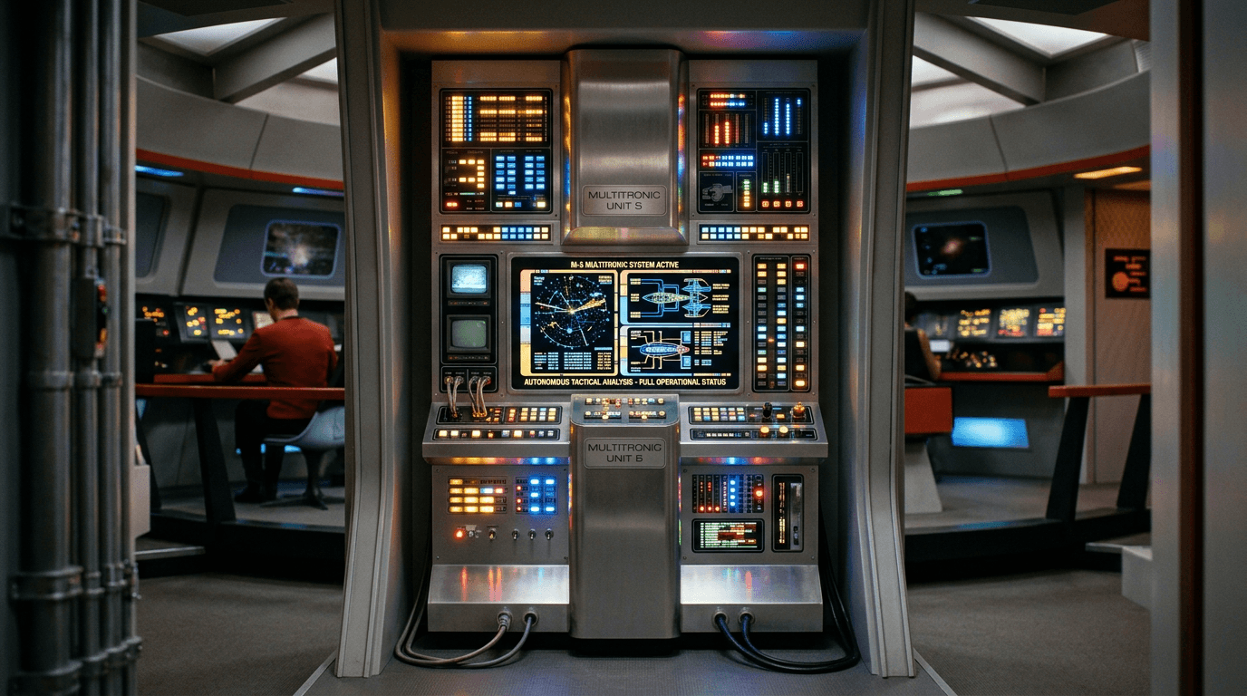 The Multitronic M-5 represents a conceptual milestone in autonomous military command systems, envisioned as a tactical computer capable of assuming complete operational control of a starship during combat scenarios. The system was designed to integrate multiple critical functions—sensor data fusion, threat assessment, target prioritization, weapons coordination, and power distribution—into a unified decision-making framework that could respond to tactical situations faster than human crews. Unlike conventional automation that assists human operators, the M-5 was conceived as a replacement for bridge personnel entirely, embodying an early exploration of what would later be termed "full autonomy" in military contexts. The underlying premise was that computational systems, freed from human limitations like fatigue, emotional bias, and reaction time, could optimize combat effectiveness while reducing crew casualties. This narrative concept emerged during an era when science fiction frequently grappled with the tension between technological capability and human judgment, particularly in high-stakes military applications.