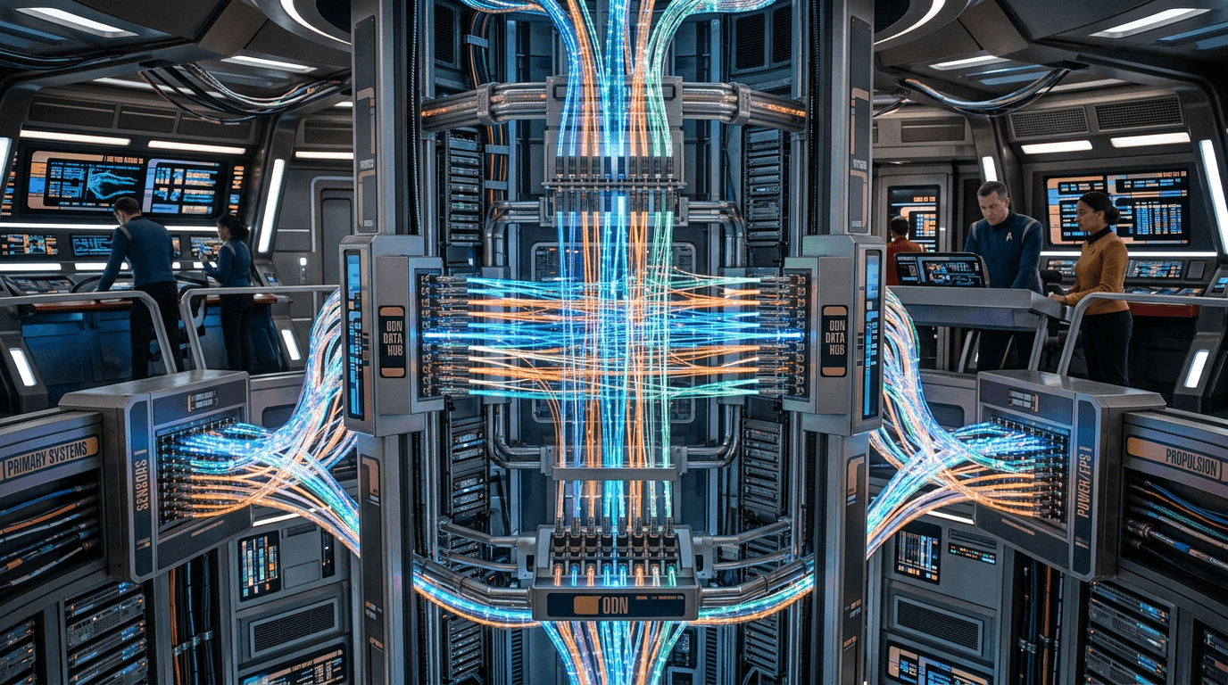 From a plausibility standpoint, optical networks face several constraints rarely addressed in fictional portrayals. Physical fiber-optic cables remain vulnerable to mechanical damage, thermal stress, and radiation-induced darkening in space environments, requiring either extensive shielding or frequent replacement cycles. The "hot-patching" concept assumes a level of automated reconfiguration and self-diagnosis that exceeds current capabilities, though research in software-defined optical networks and autonomous fault detection indicates progress toward such systems. The primary speculative leap involves the scale and integration depth portrayed in fiction, where ODNs connect thousands of subsystems with near-instantaneous reconfiguration capabilities. Achieving this would require advances in photonic switching speeds, standardised optical interfaces across all ship systems, and artificial intelligence capable of managing network topology in real time. As spacecraft become more complex and data-intensive, some form of high-bandwidth photonic backbone appears increasingly plausible, though the seamless, damage-resistant networks of science fiction remain aspirational rather than imminent.