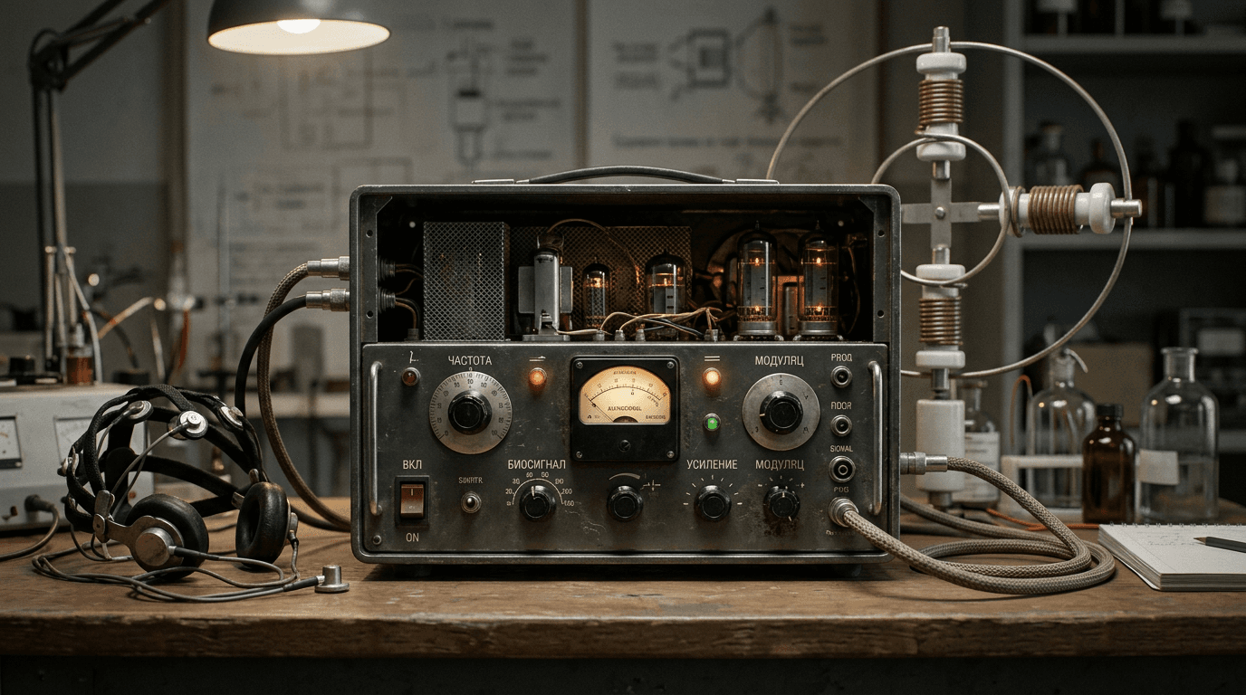 The Alpha-Wave Radio Interface represents a specific hardware implementation from Soviet biocommunication programs (documented in alleged 'Proekt Orion 1983' KGB archives), claiming to bridge human nervous systems with external signal equipment through electro-neural coupling. The device allegedly converted operator alpha-wave brainwave patterns (8-13 Hz EEG rhythms) into low-bandwidth coherent radio emissions, enabling transmission of emotional states to remote receivers.