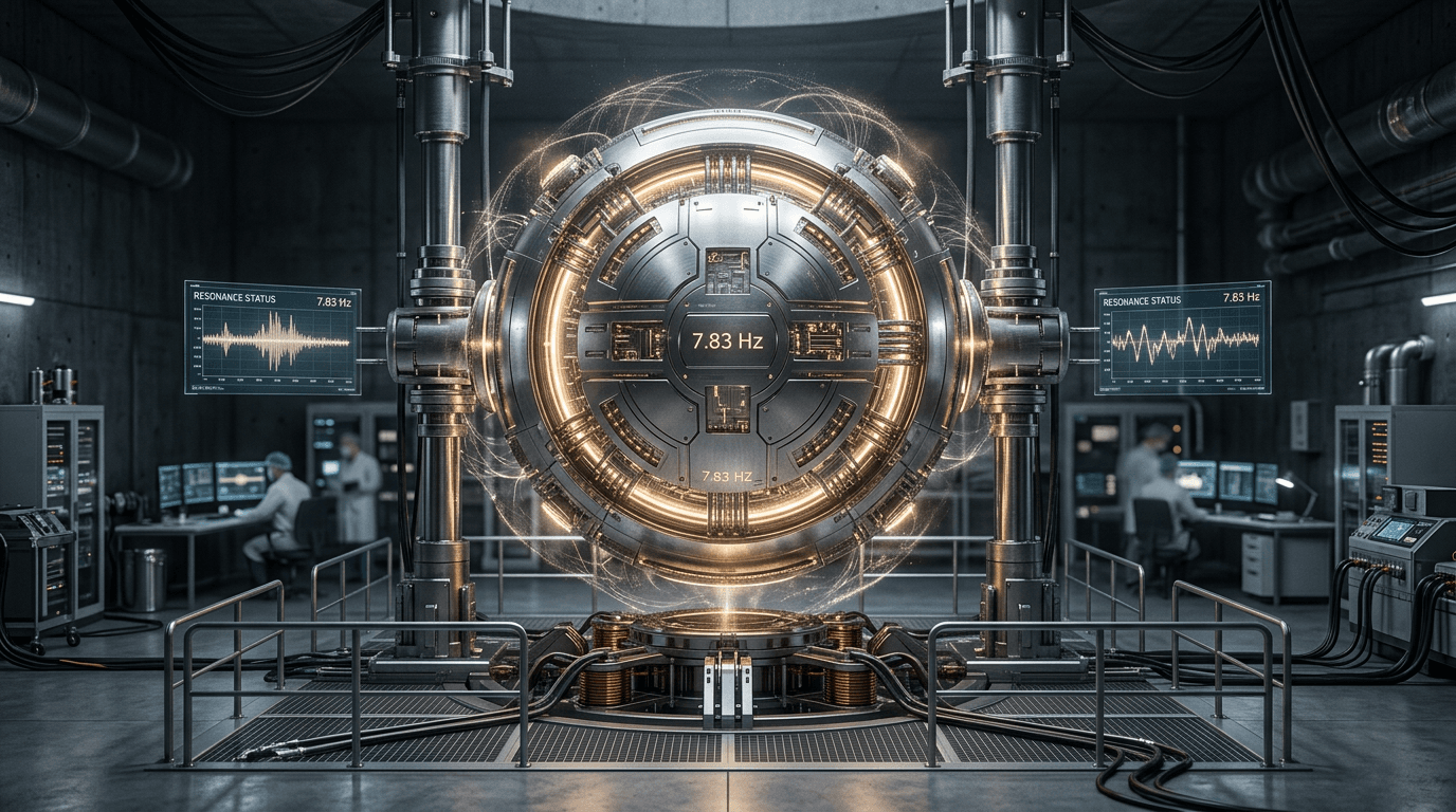 Large metallic sphere (dimensions not specified, likely 2-3 meters diameter based on descriptions) with internal rotating components generating or amplifying 7.83 Hz electromagnetic oscillations. The chamber provided electromagnetic shielding from external fields while internally generating the resonant frequency. Subjects seated within reported visual distortions, altered time perception, enhanced psi abilities, and 'loss of time sense.' The apparatus combined Faraday cage isolation (blocking external EM) with active Schumann frequency generation—creating controlled EM environment hypothetically matching Earth's natural resonance.
