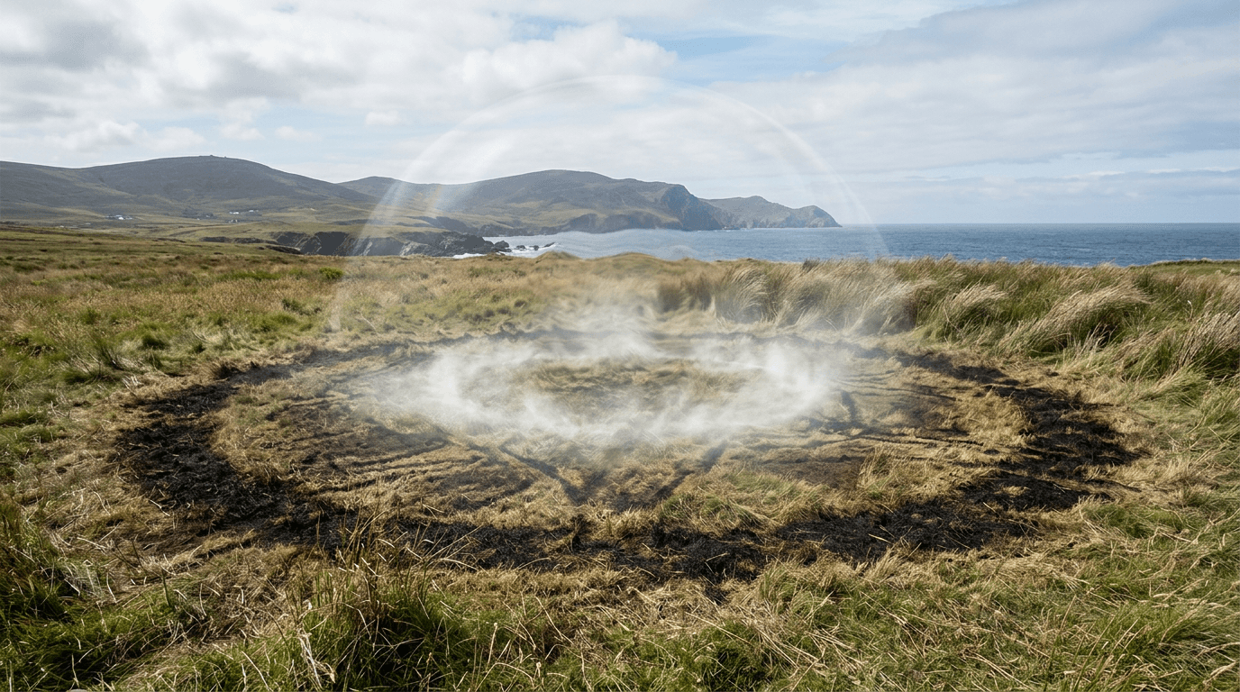 Encounter records describe craft producing tightly bounded environmental effects: localized haze or shimmering without thermal exhaust; lensing-like air distortions near edges; micro-fog or ionization clouds forming and dissipating abruptly; compressed air 'pressure domes'; and ground phenomena including concentric rings, soil glazing, magnetic/compass anomalies at trace sites, vegetation singe, and residual EM coupling detectable by instruments.
